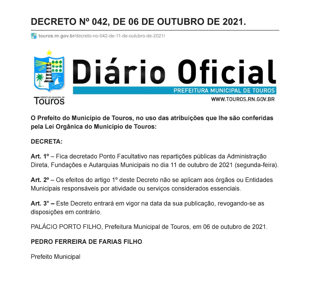 O prefeito de Touros Pedro Filho decretou Ponto Facultativo nas