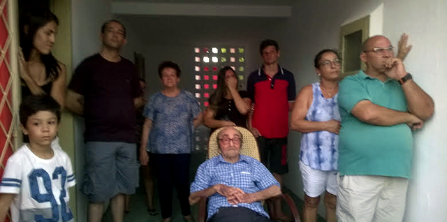 Sentado, o escritor Geraldo Gonzaga acompanha as apresentações e homenagens, ladeado dos filhos, netos e bisnetos