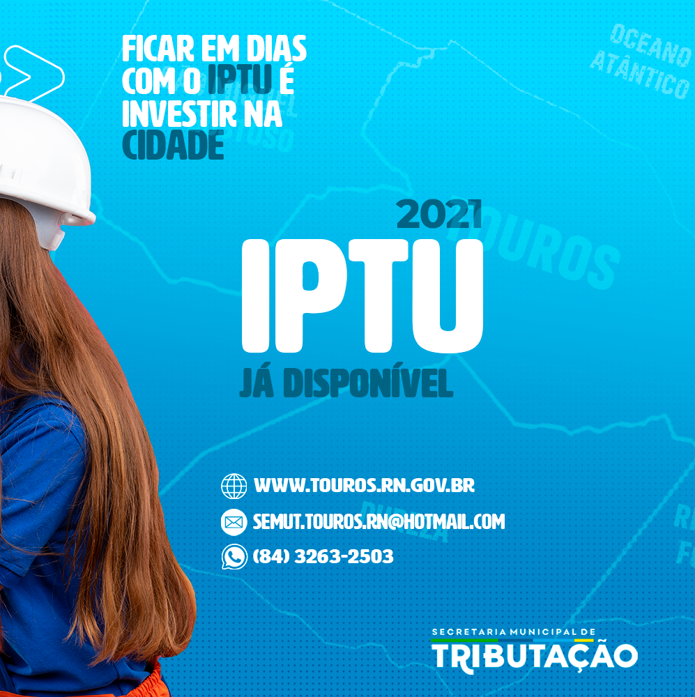 A Secretaria Municipal de Tributação torna público o Lançamento do IPTU 2021, disponibilizando a versão On-line do Carnê, podendo ser adquirida pelo site do Município, e-mail ou atendimento via WhatsApp, poderá ser dividido em até 6 (seis) parcelas mensais e sucessivas, respeitado o valor mínimo de R$ 30,00 (trinta reais) por parcela, com descontos seguindo a regra do Artigo 2º do Decreto Nº 024 de 20 de maio de 2021.