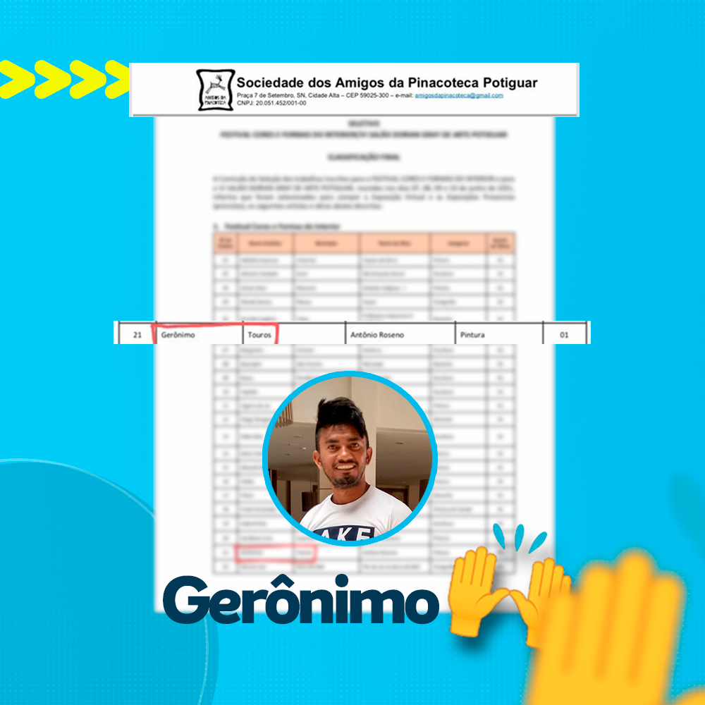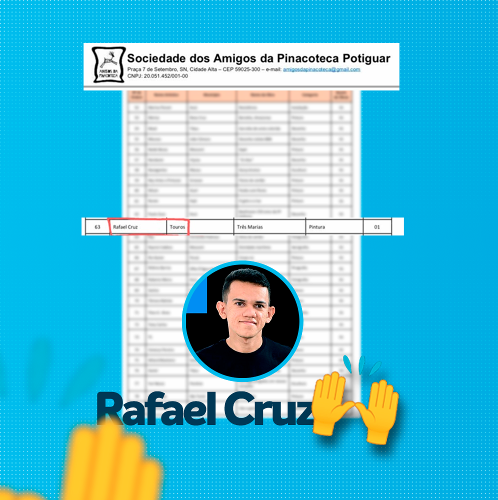 A Prefeitura Municipal de Touros vem parabenizar os artistas da terra, Rafael Cruz e Gerônimo Moura, que tiveram suas obras selecionadas para a exposição CORES DO INTERIOR.