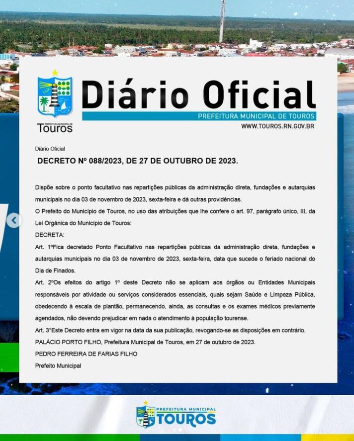 Em razão do feriado nacional de Dia de Finados, no dia 02 de novembro, está decretado Ponto Facultativo nas repartições públicas da administração municipal no dia 03 de novembro, sexta-feira.