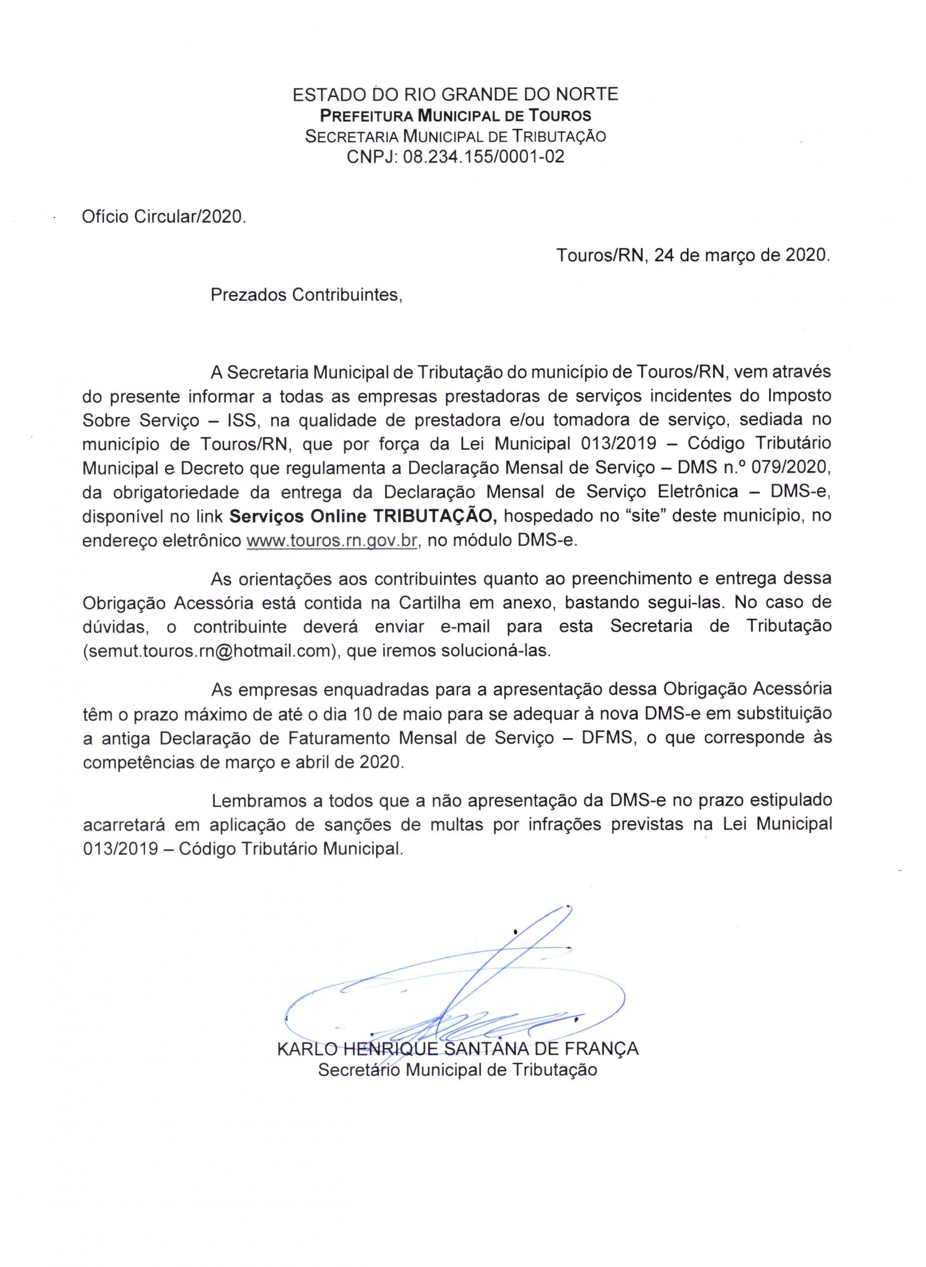 OFÍCIO CIRCULAR AOS CONTRIBUINTES