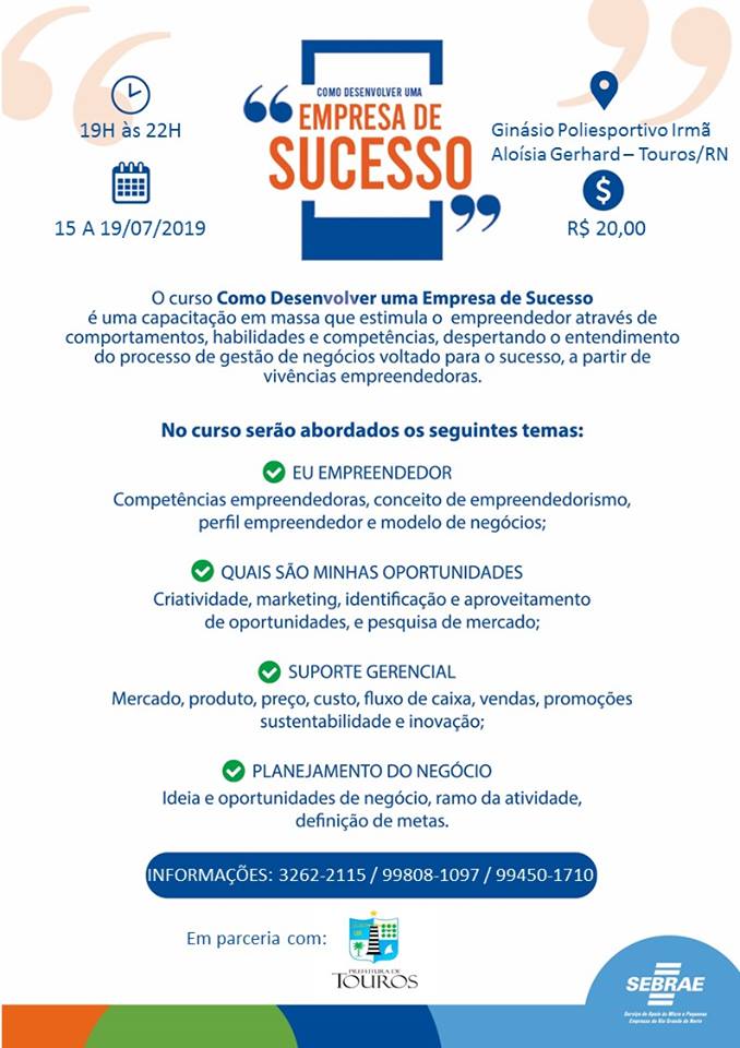 A Prefeitura de Touros, em parceria com o SEBRAE, irá