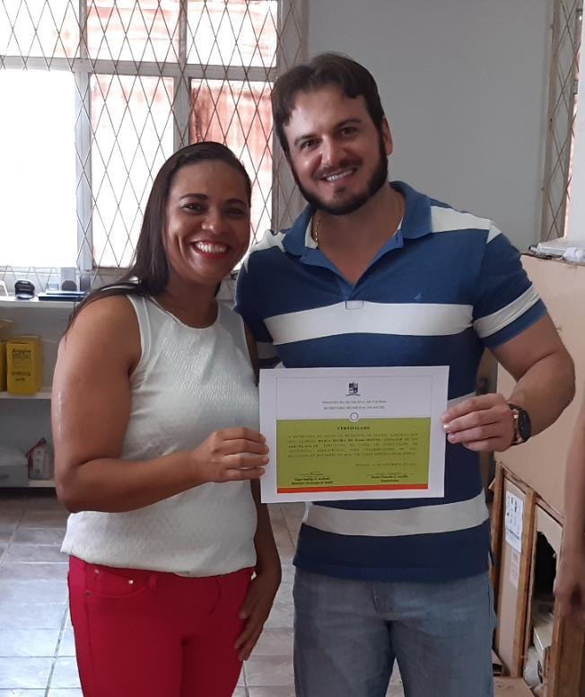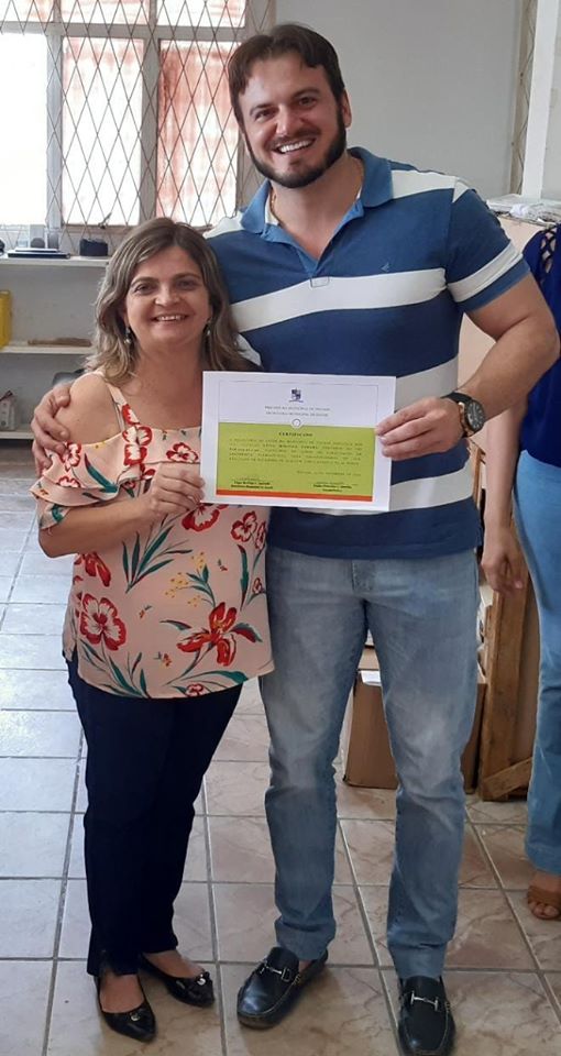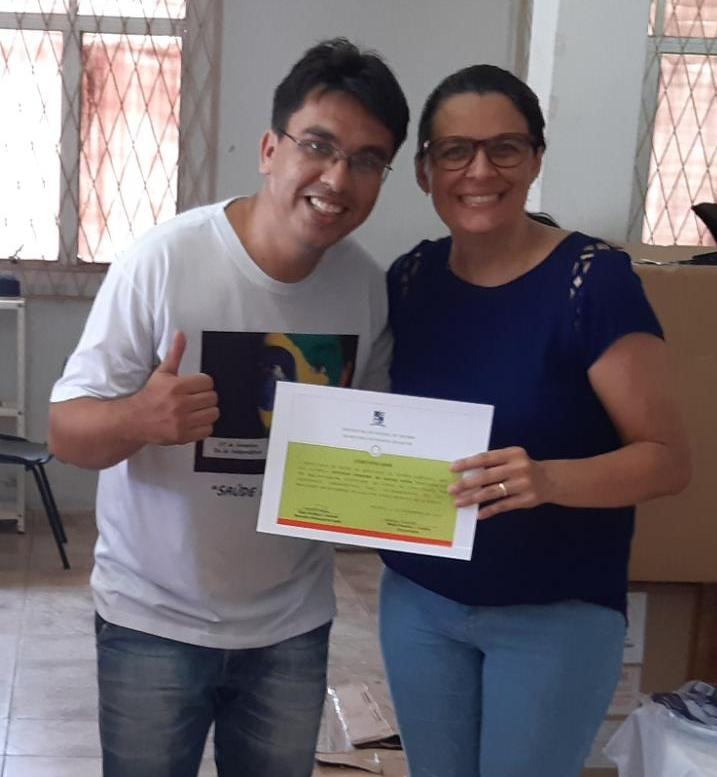 O Secretário de Saúde, Higor Andrade e a farmacêutica, Mailre Praxedes, entregaram os certificados aos profissionais da Central de Abastecimento Farmacêutico (CAF) da Farmácia Hospitalar que participaram e concluíram a Capacitação em Assistência Farmacêutica para colaboradores do SUS.