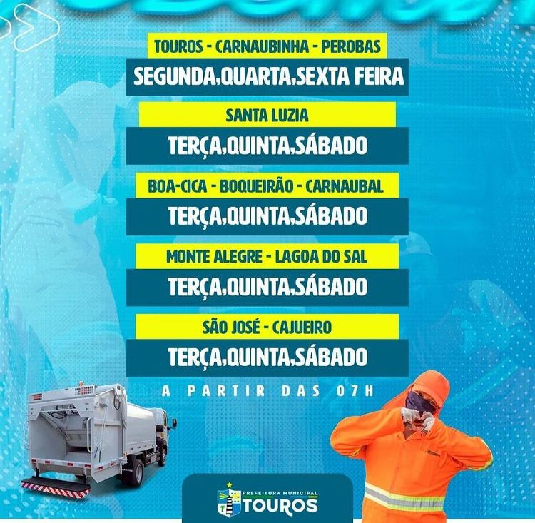 Fique atento ao calendário da coleta de lixo no Município de Touros, nesse post você tem todas as informações dos locais, dias e horários. 👆🏼