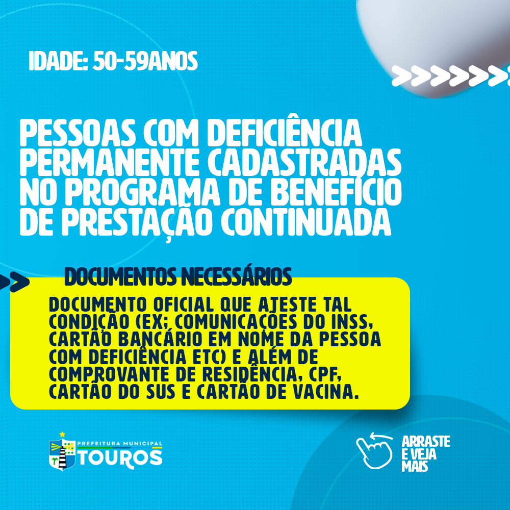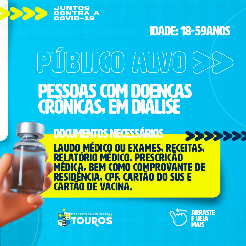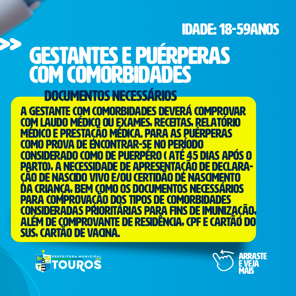 A Prefeitura Municipal de Touros, através da Secretaria de Saúde, informa que já está na fase 1 das comorbidades para vacinação contra a COVID-19.