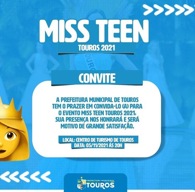 A Prefeitura Municipal de Touros prestigiou, apoiou e acompanhou o Miss Teen Touros 2021, que aconteceu, no último sábado, dia 05/11, no centro de turismo, onde houve a escolha da nova representante Miss Teen Tourense. O evento ocorreu seguindo todos os cuidados necessários e protocolos da saúde, orientados pela Organização Mundial da Saúde e Ministério da Saúde.