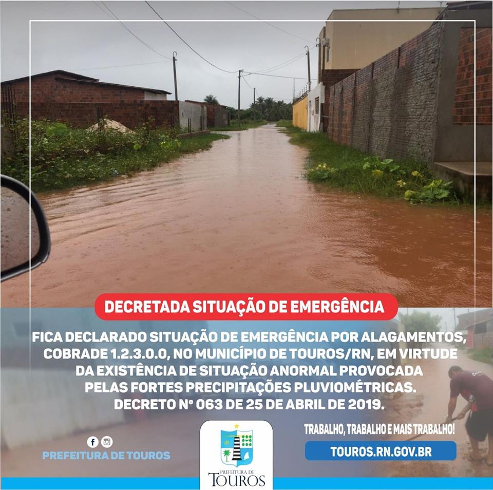 Diante das chuvas intensas na região, Prefeito de Touros e Conselho Municipal de Defesa Civil se reuniram na manhã de hoje para traçar plano de ação nas áreas alagadas da cidade, e frente ao atual contexto se faz necessário a decretação de Situação de Emergência.