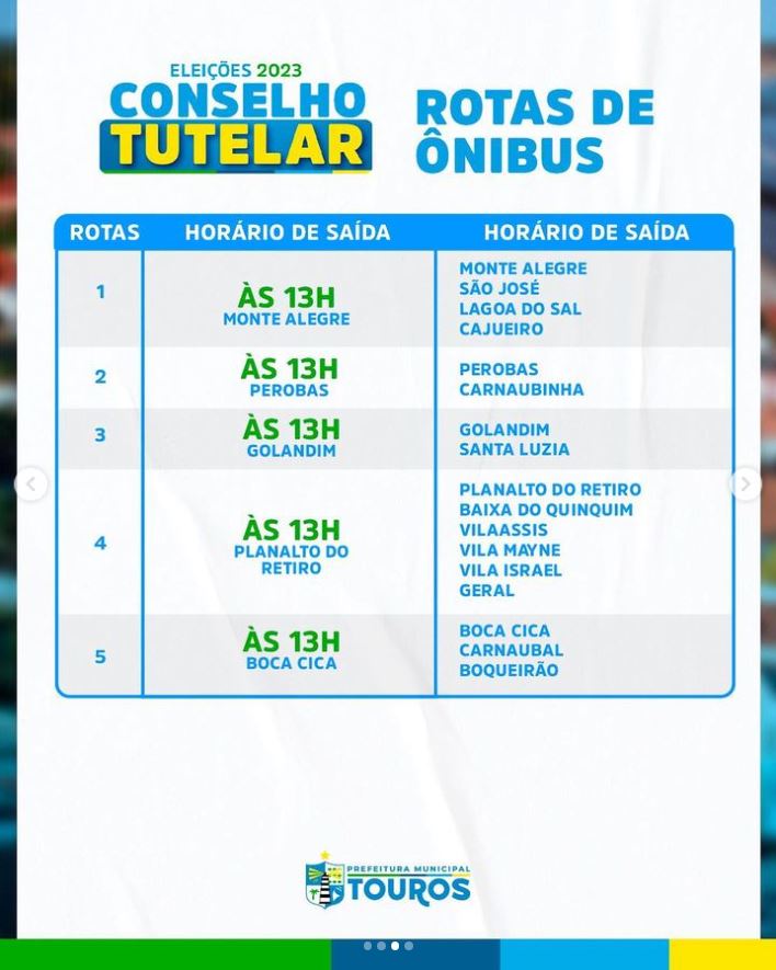 Os horários de saída dos ônibus dos distritos de Touros/RN para a eleição do Conselho Tutelar 2023 estão disponíveis agora. Planeje seu dia para garantir que sua voz seja ouvida e seu voto conte. Junte-se a nós no dia 1° de outubro e faça a diferença!