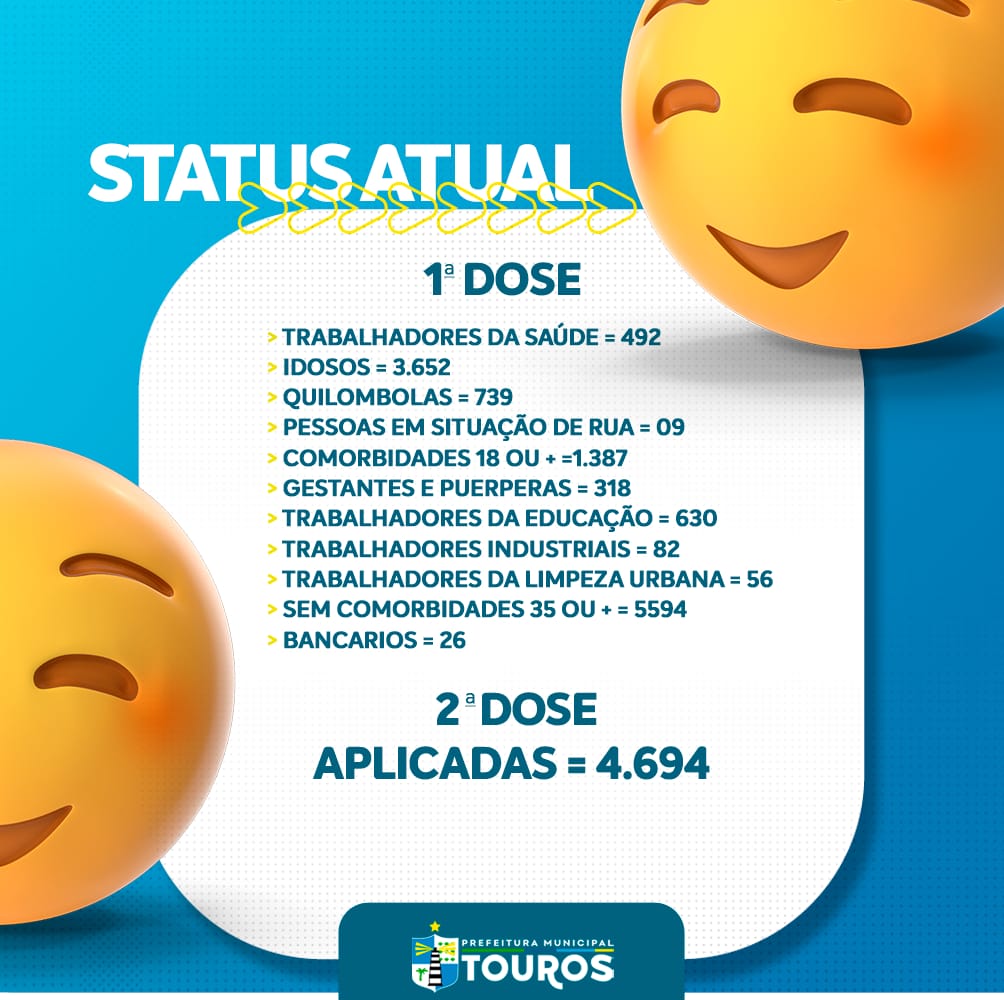 A Prefeitura Municipal de Touros divulga mais uma atualização do vacinômetro. O resultado tem sido positivo. Estamos no caminho certo.