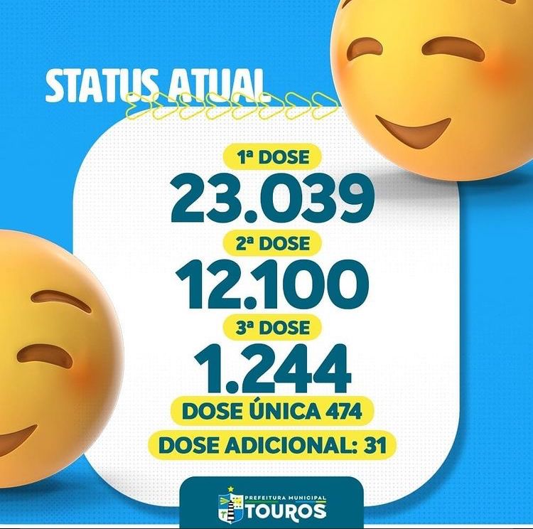 A Prefeitura Municipal de Touros realiza mais uma atualização do vacinômetro. A gestão municipal está trabalhando a todo vapor em prol do combate à COVID-19.Com força, fé e a esperança de dias melhores venceremos essa batalha!
