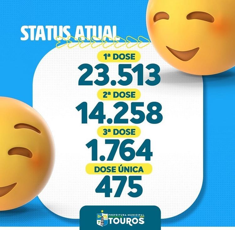 A Prefeitura Municipal de Touros, através da Secretaria de saúde, divulga mais uma atualização do vacinômetro para a população tourense.A vacina é um dos principais meios de combate à COVID-19, vacine-se, as vacinas salvam vidas.